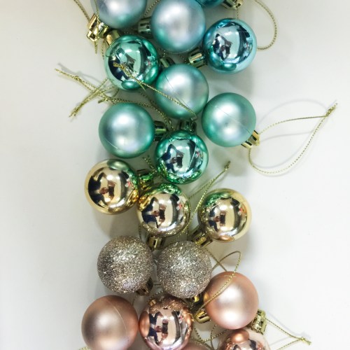 Pastel orb ornaments hung in a gradient pattern ($3 for 25 at Target)