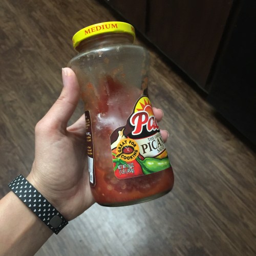 2. Prep your jar. I used a salsa jar, which still had salsa in it, and since I don’t waste salsa EVER, I poured it into a plastic food saver and proceeded to wash the jar.