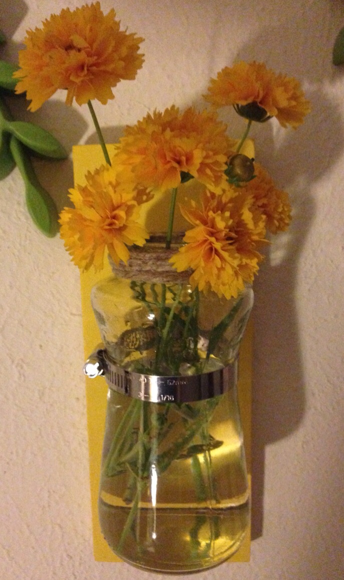 6. Insert the jar in the hose clamp, and use a flathead screwdriver to tighten the hose clamp down taut so that the jar has no wiggle room. Not too tight, though, you don’t want to break your vase!