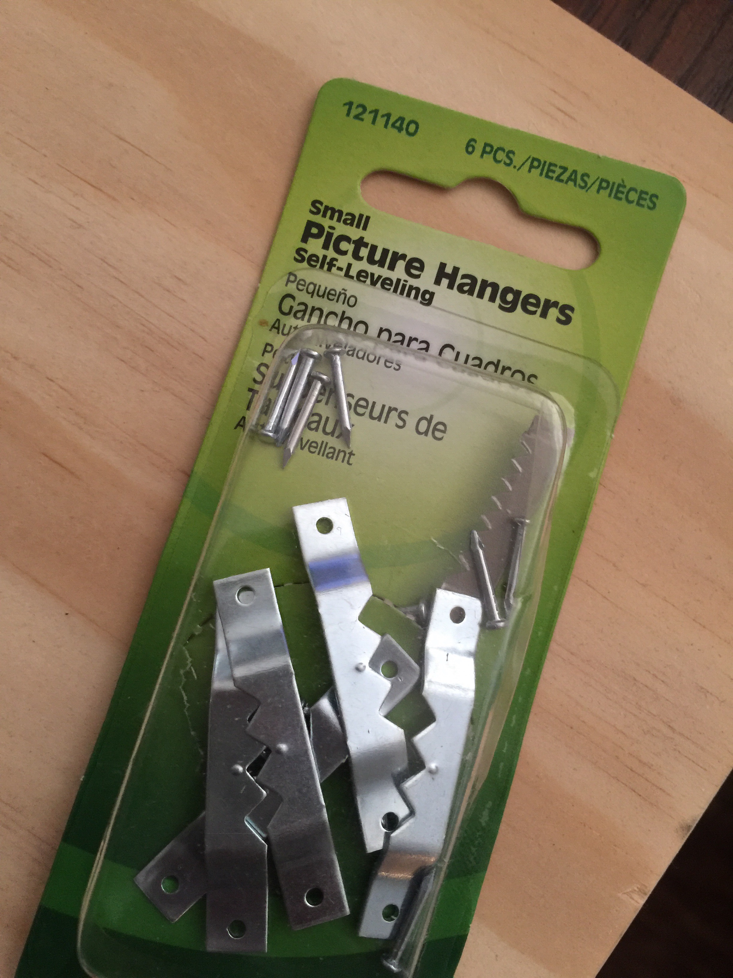 4. Attach your sawtooth hanger to the back of your board. Because I did a vertical bud vase I attached it to the very top in the middle, using the tiny nails that come with the hanger, and a hammer. If you’re making a horizontal hanger, you’ll probably want to use two sawtooth hangers towards each top corner of the board. Because I sometimes get asked what a sawtooth hanger is, look here: