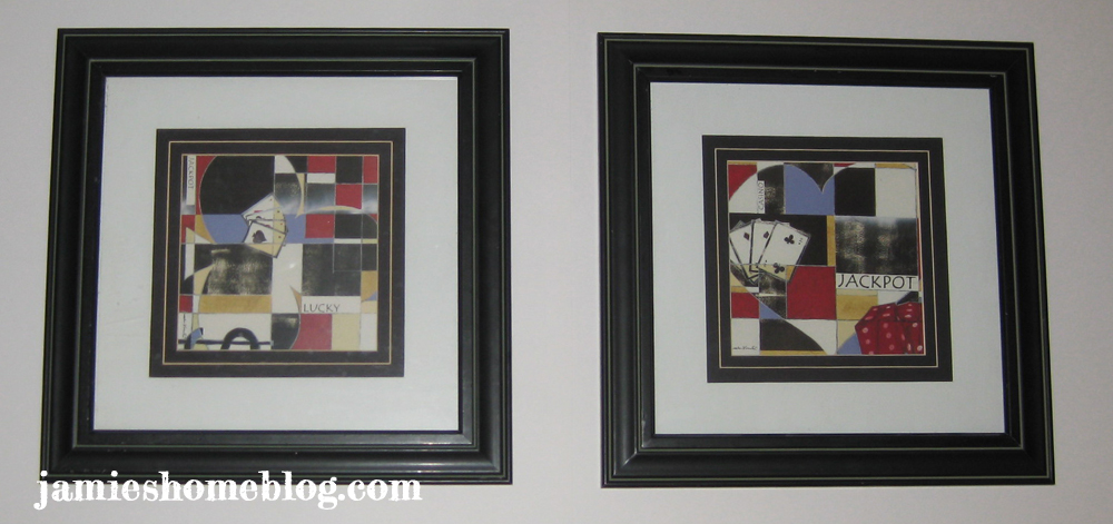 So lets talk about what I used to frame them, yes?  These 13.5″ square frames (17.5″ including the frame) with uhh, gambling prints (?) were a freebie from the fella’s mom’s coworker (try to stay with me).  The price tags on the back said they were $59.99.  A piece.  That’s a lotta dough, yo.  I’m lucky to know folks that will give me things like this for free!