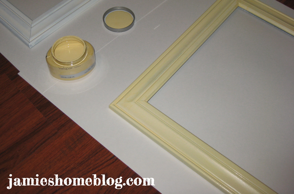 After I pulled 30 some staples out of each frame I primed them (Zinsser B-I-N spray) and painted them using some of my leftover Delightful Moon by Valspar, which I also used on some art in my living room.