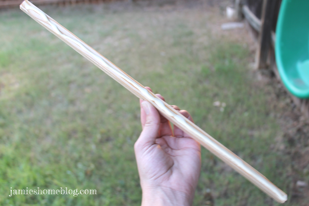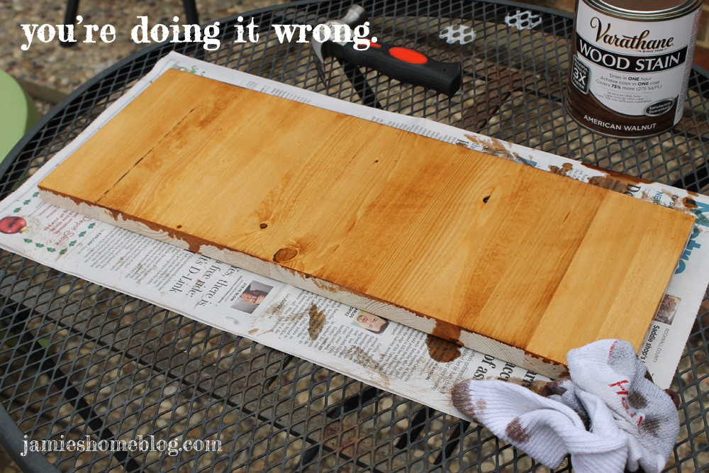 First, I took a scrap piece of wood I had and stained it. Incorrectly (mistake number one). You know how the can says shake well? Do that. Or you’ll end up with this.