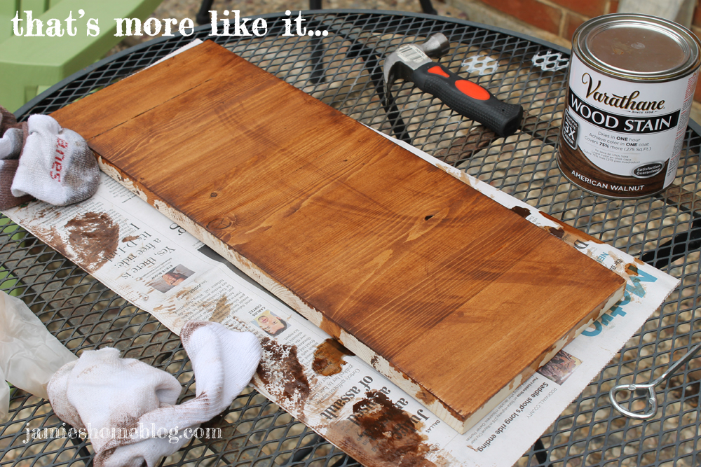 If you’ve never stained wood before, trust me, it’s easy. Make sure you read and follow all instructions (including the ones for safety) but the gist of it is that you liberally apply stain to your wood, let it sit for a few minutes to penetrate and then wipe off the excess.