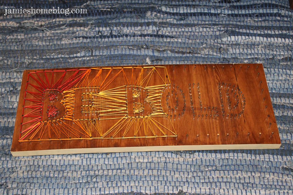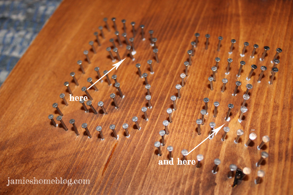 Oh, I know I say this a lot, but one thing you really need for this project is patience. I am super happy with my string art, but it took several days to finish. I really didn’t consider how long it would take to hammer 321 (yeah, that many) nails into a board, close together, in a specific design. It’s tedious work and can be really tiring on the eyes. And I happened to make a grand total of seven tiny-huge mistakes while making this dern thing.