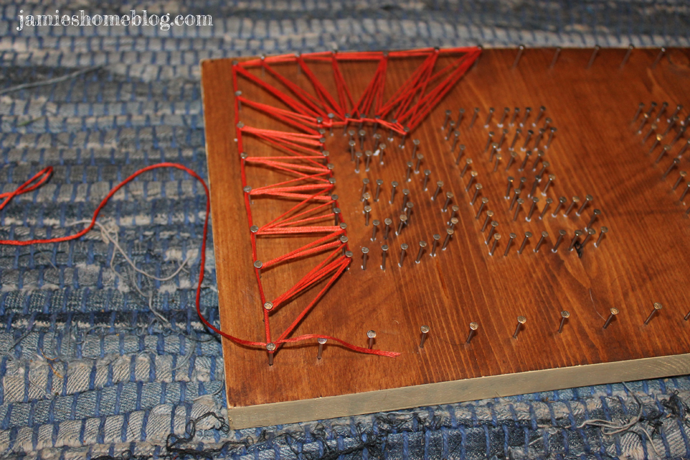 After all the words were nailed in I carefully ripped my paper template away from the nails.