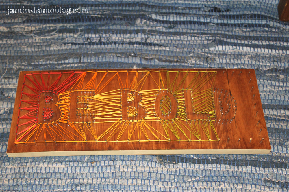 It was at this point that I realized that I hadn’t yet attached my saw-tooth hanging brackets to the back (yes, mistake number five). So I clenched my teeth, flipped the board over in my lap and hammered in the brackets while the words BE BOLD dug into my thighs.