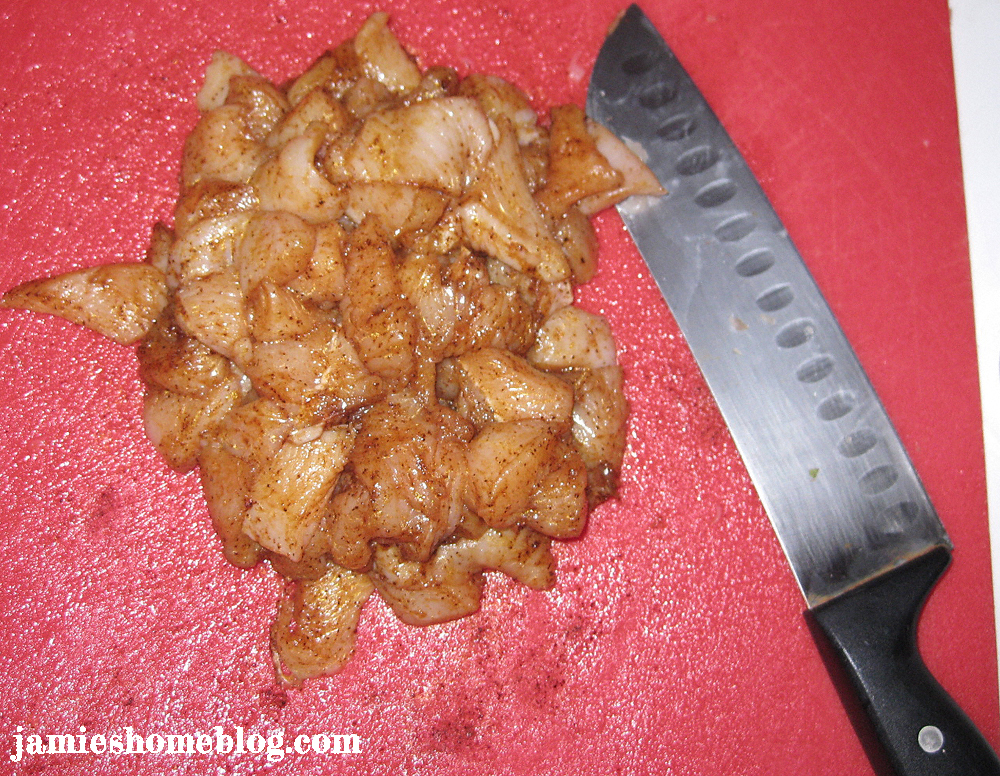 To start, cut your chicken breasts into one-inch cubes. Pop them in a bowl with a drizzle of olive oil and your spice mixture and stick them in the fridge while you get busy with your quinoa.