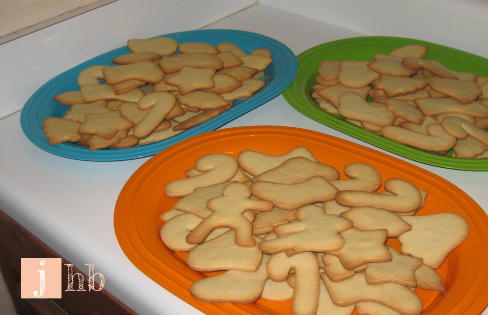 I use this recipe from Bee in our Bonnet.  The recipe makes about 140 cookies when I use my Wilton Christmas cutters, so I have plenty for our families and friends!  And seriously, the royal icing is the best thing EVER.  Any recipe that calls for 2 lbs of powdered sugar is A-OK with me (that would be the royal icing folks).  Tip: I opted to roll my dough out between two pieces of saran wrap, and dipped my cookie cutters in powdered sugar instead of flour.  The flour can dry out the dough and I’ve found that powdered sugar doesn’t have the same drying effect.  If you ever feel like looking at something pretty, check out Bee in our Bonnet‘s website.  Their cookies are so beautiful; they’re little works of art!