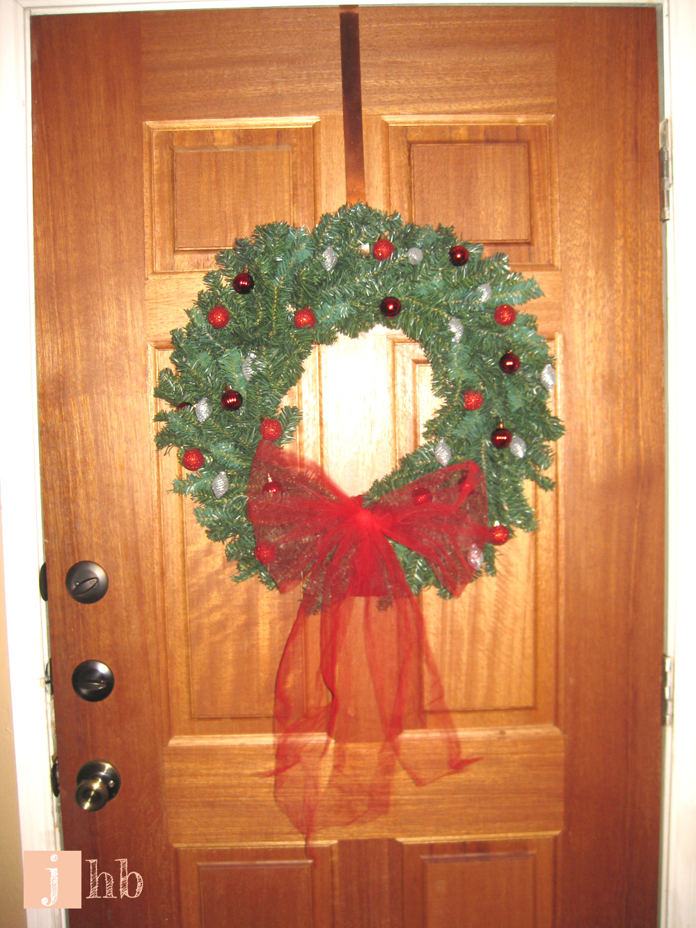 I also whipped up a quick wreath for our door.  I just hung some tiny ornaments on it, tied a bow of red tulle to the bottom and called it a day.  We have a storm door, and our door doesn’t face the street, so I opted to hang it inside instead of outside.  We get more face time with it that way anyway.  If its been made, someone should see it, right?!