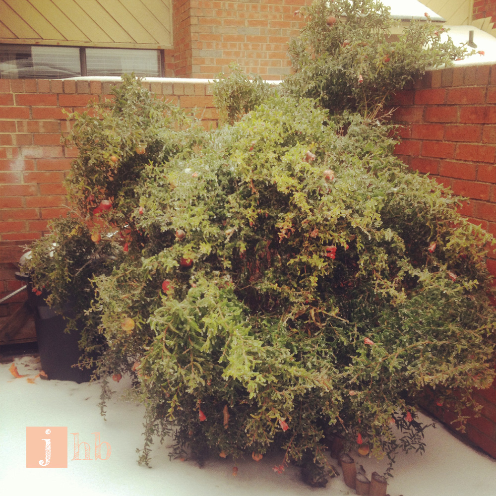 Unfortunately, that is ice, not snow.  Look what it did to our poor pomegranate bush!  Trust me y’all… it’s never looks saggy like this.