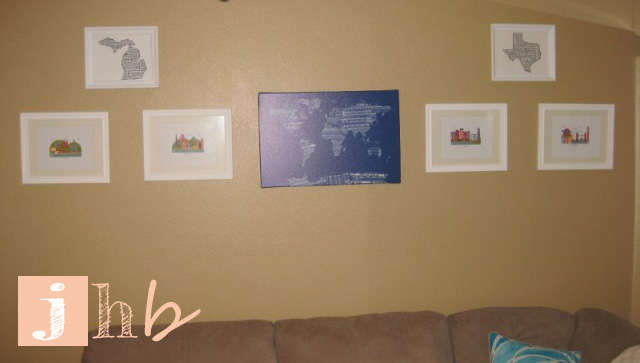 I don’t think frame galleries always have to be exactly symmetrical but it worked best for these prints.  That may change if I find myself adding to this group later on, who knows.  For now, they look great where they’re at!  Now me and the fella are reppin’ our favorite states with style!