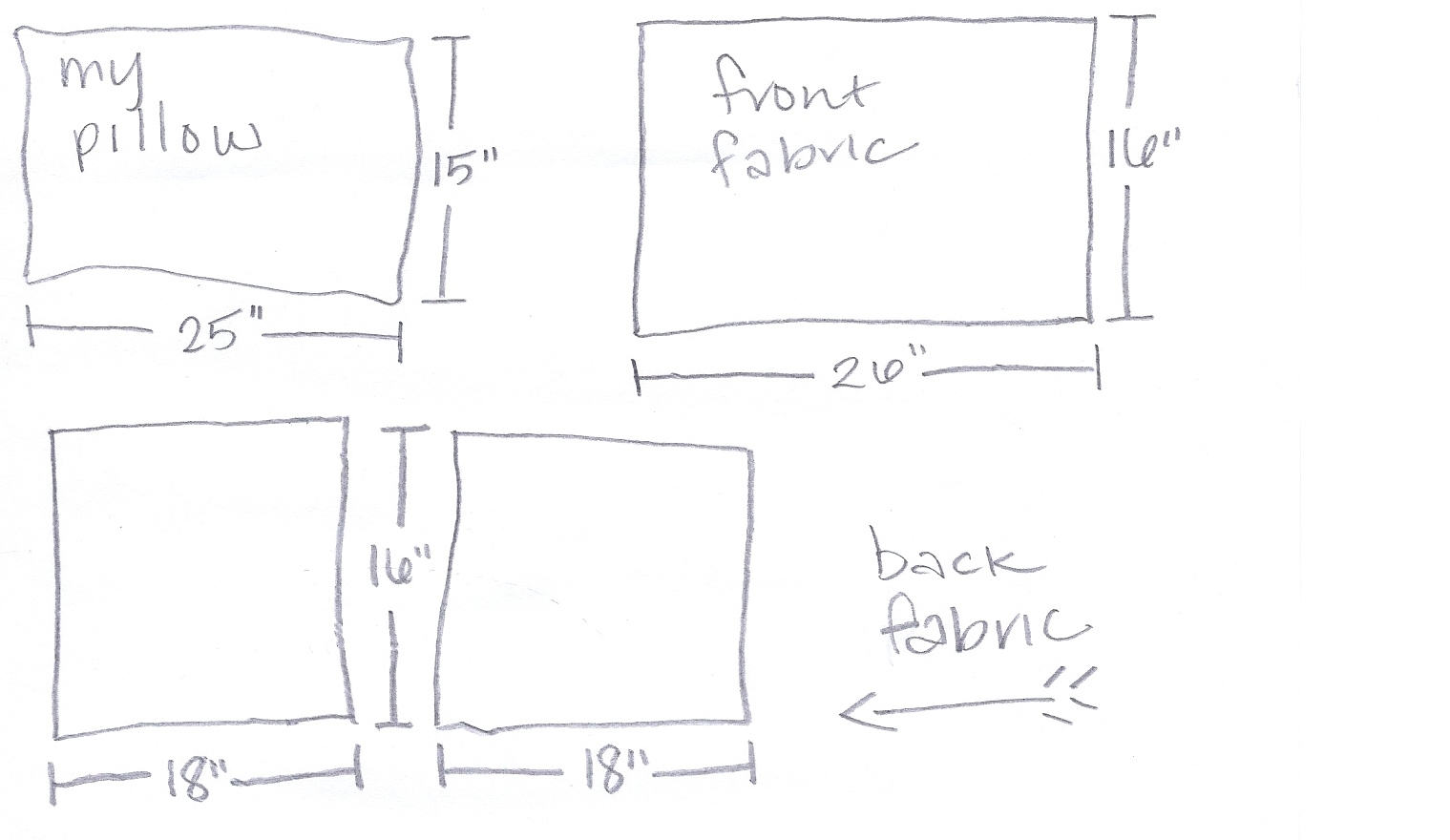 The back is made of two pieces, and one overlaps the other. For this to work, they each need to be 1″ wider than your width (again 16″ in my case) half of the length of your front piece plus five inches. Let me explain as it relates to my pillow. My pillow was 25″ long and 15″ wide so my front piece was 26″ and 16″ wide. 26″ long divided in half is 13″. Plus five inches is 18″. So each of my back pieces were each 16″ wide and 18″ long.