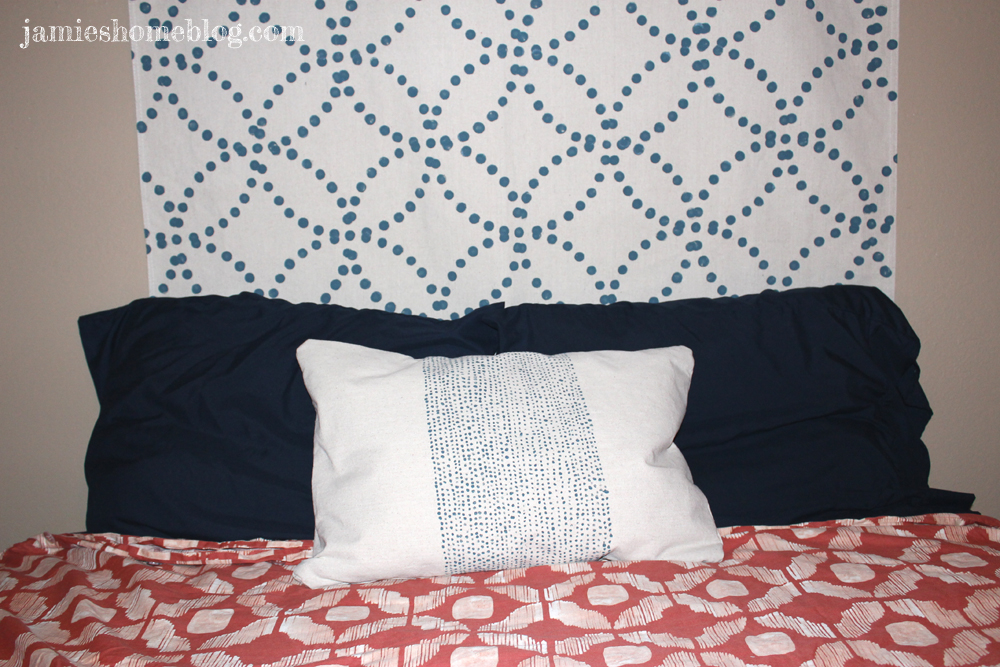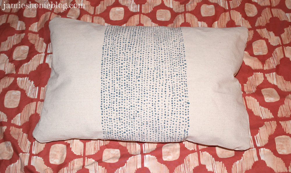 For my front, to recreate the look of this pillow, I used my Valspar Perfect Storm paint sample (also used on my headboard and some wall art) and a small watercolor brush. I used a ruler for the middle row of dots to line everything up but after that I just free handed 16 rows on either side of the middle row. It didn’t take long at all to dry, maybe 10 minutes after the last row was dotted, it was dried.